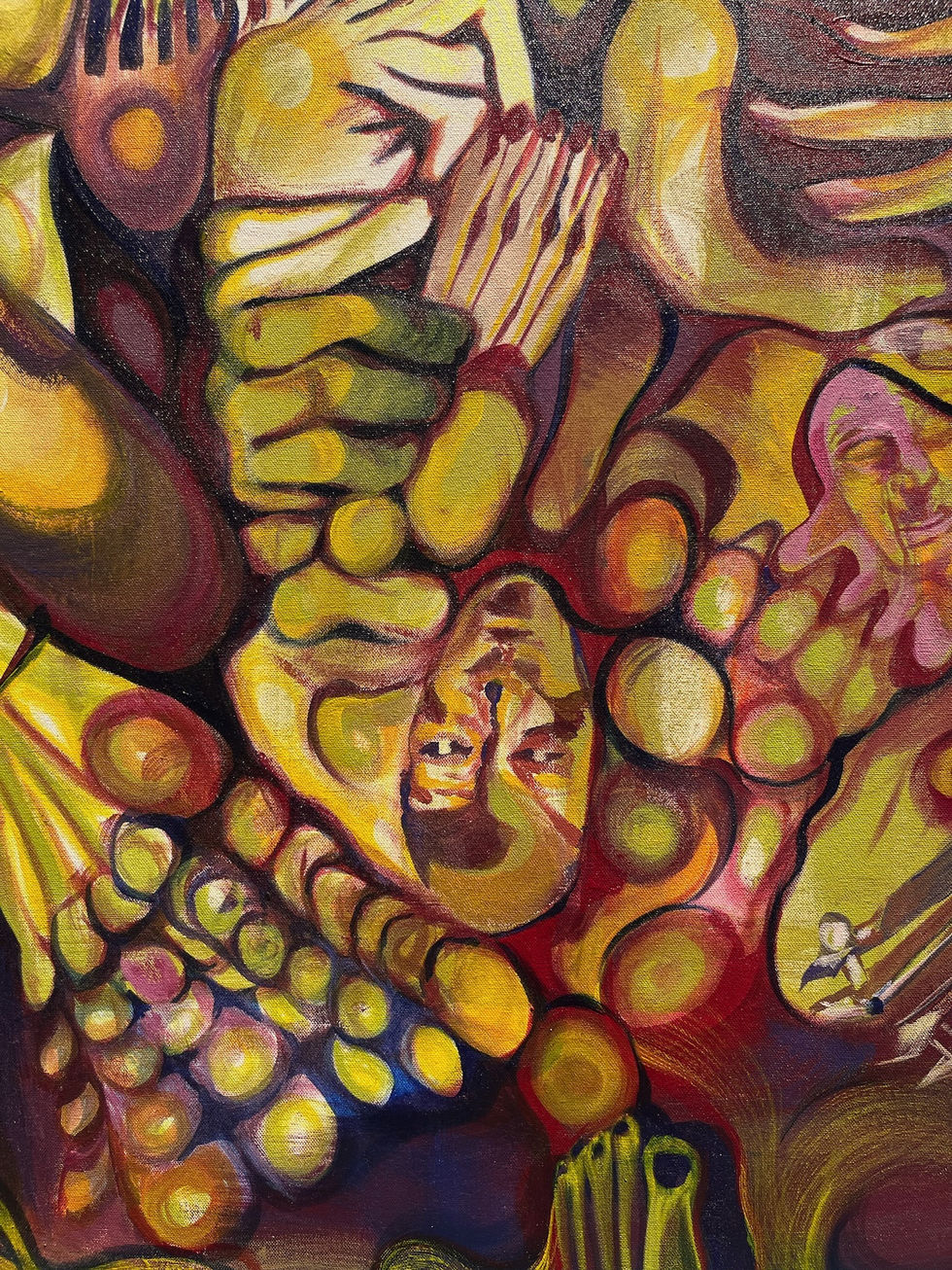 Immerse yourself in a “Nakhun”-a piece that speaks of healing, trust, and the quiet acts of love that shape our life’s journey. This painting invites you to reflect on the profound beauty found in life’s simplest rituals- like taking the time to care for one’s nails, from the beginning. How showing up for that same little repetitive task everyday, requires great courage in itself. With a deeply personal narrative, she honours the transformative power of self-care, reminding us that the most meaningful expressions of love often start with ourselves. In the world of Tikkalaa, this self-love and personal growth unfold through vibrant acrylic hues and strokes like flows of love.